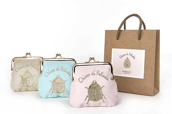 Si tratta di un portagioie con ricamato sul fronte uno scarabeo d’oro, simbolo portafortuna da sempre. Una speranza per tutti i bambini che vivono in condizioni di disagio. Il Chicco di Felicità sostiene anche quest’anno l’Associazione CAF. La Limited Edition by Monica G. è disponibile in tre differenti colori pastello (rosa, azzurro ed ecrù).